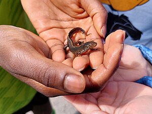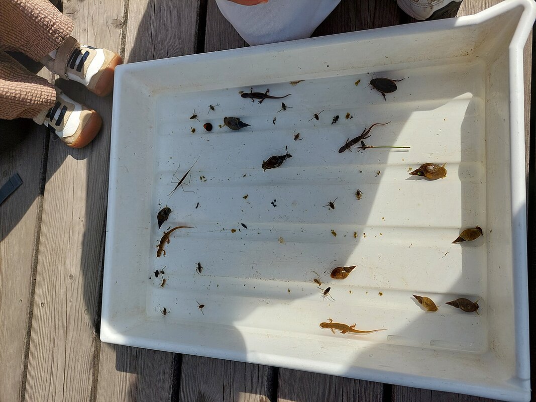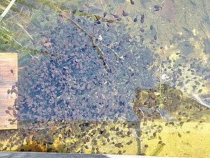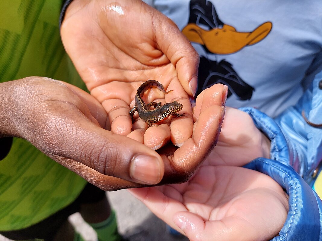 Dank der guten Bedingungen vor Ort konnten bei allen Exkursionen Bergmolche, Teichmolche und sogar die eher seltenen Fadenmolche gefunden werden. Initiator Jörn Ziegler, Lehrer an der Station Natur und Umwelt, wollte herausfinden, ob die Amphibien den neuen Teich des Stationsgeländes bereits angenommen haben und dort nachweisbar sind. Nach der Exkursion waren sich alle einig: Die Amphibien haben den Teich bereits besiedelt und fühlen sich dort offensichtlich wohl – denn die SchülerInnen entdeckten zwischen den Wasserpflanzen in der Uferzone zahlreiche Kaulquappen. Allerdings bestätigte sich auch die Vermutung von Herrn Ziegler, dass durch die Umrandung des Teiches dieser nicht so gut zugänglich ist wie beispielsweise das angrenzende Niedermoor, wo an allen Untersuchungstagen mehr Individuen gezählt wurden.
